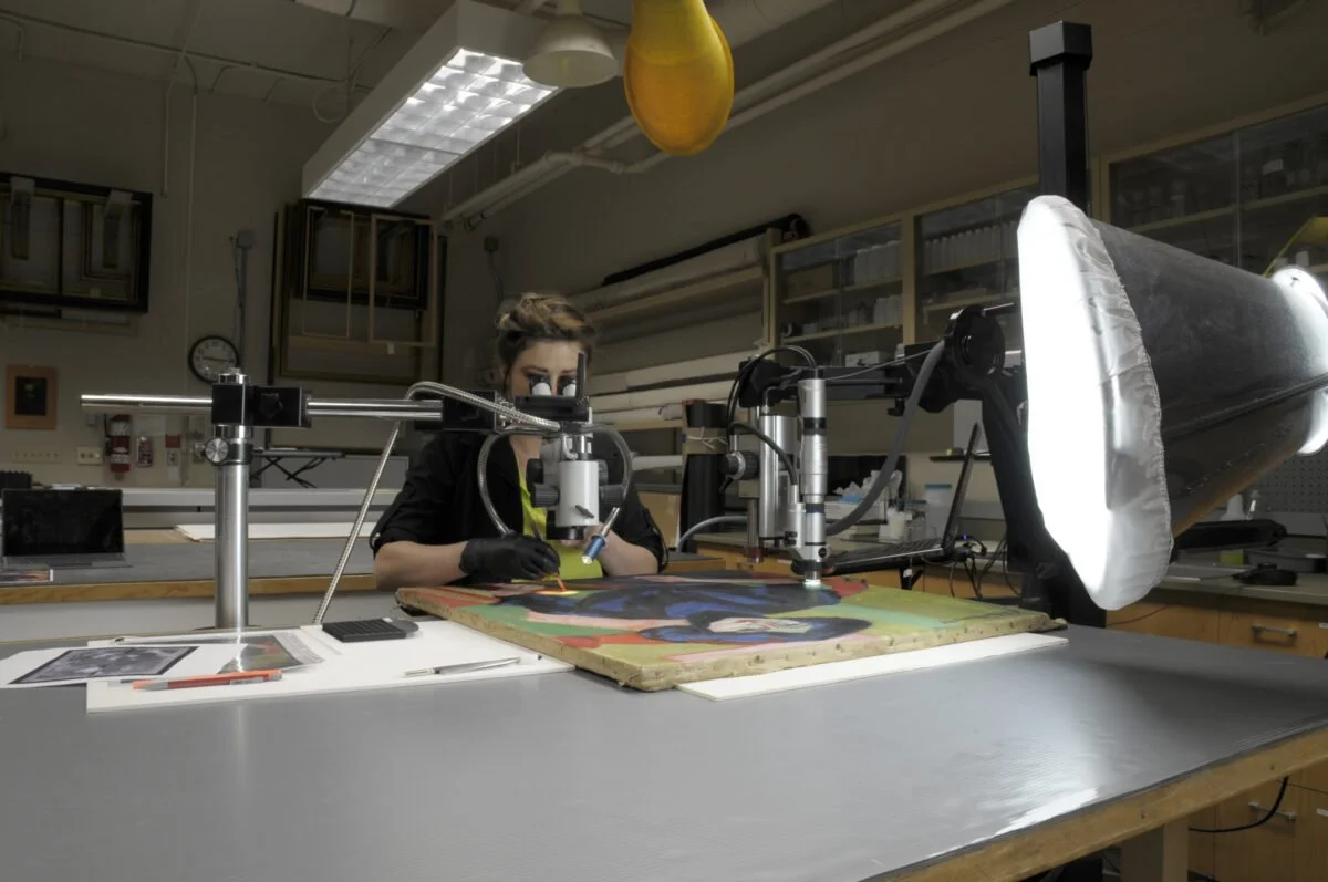 Courtney Books, conservator at the Saint Louis Art Museum examines Ernst Ludwig Kirchner's ‘Portrait of Gerti’ under a stereo microscope to see the underlying layers of paint.